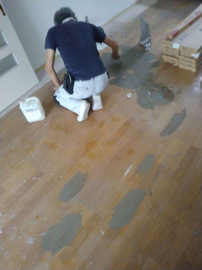 賃貸の2DKのお部屋です。既存のフローリングが痛んでいるのでフロアタイル貼る前の下地補修、下地をしっかり作らないと、浮き、上がれの原因になります。